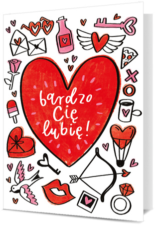 Kartka zawiera życzenia. W zestawie znajduje się koperta, kolorystycznie uzupełniająca się z kartką.
